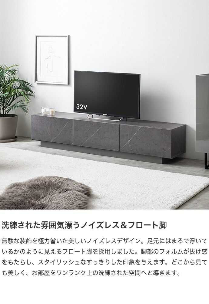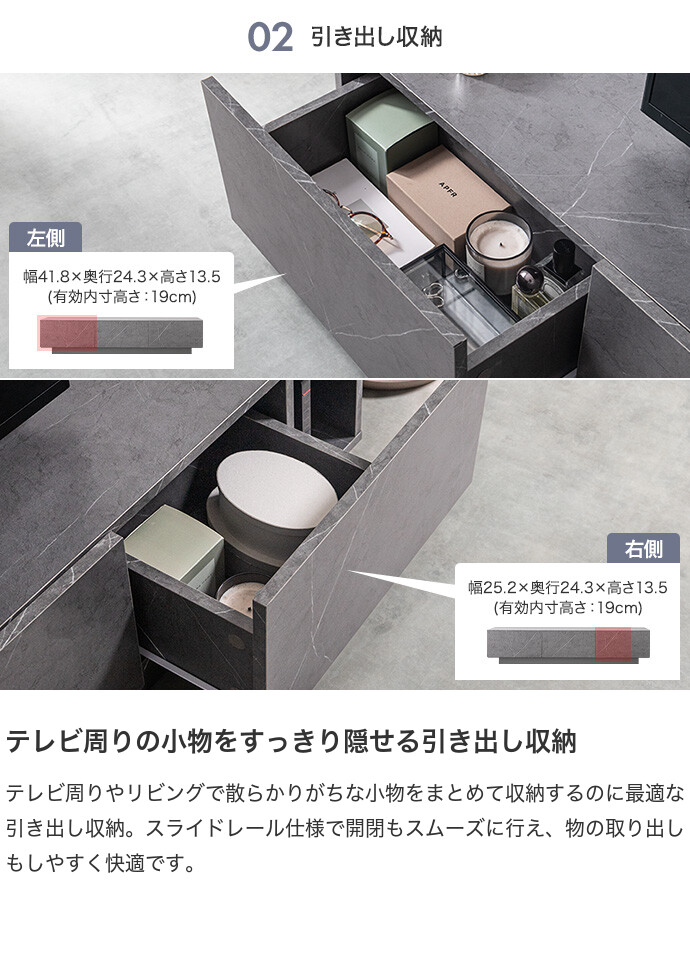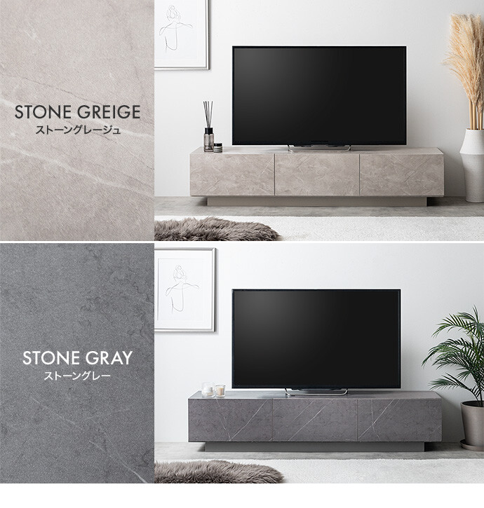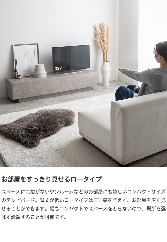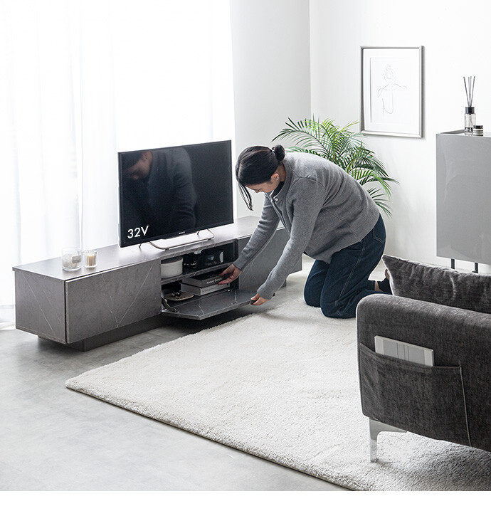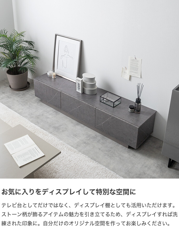 ストーン柄のニュアンスが上質な空間を作る引き出し付きテレビ台。無駄を省いたノイズレスなフォルムと、ストーン柄の組み合わせが美しいデザイン。お部屋に置くだけでアクセントとなり、洗練された空間へと導きます。また3種類の収納スペースにより、デジタル機器や小物を収納可能。視線の集まるテレビ周りをすっきり整えられるテレビ台です。