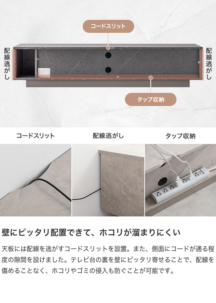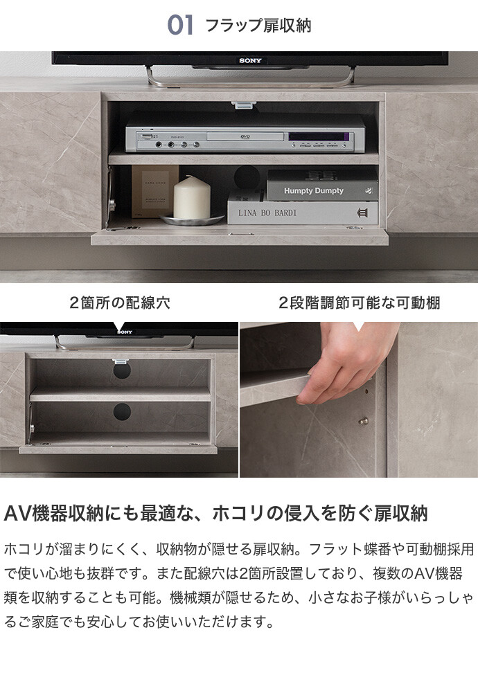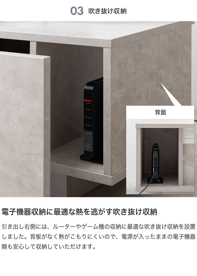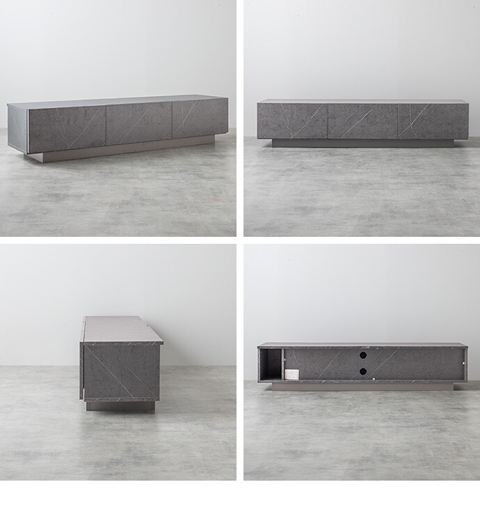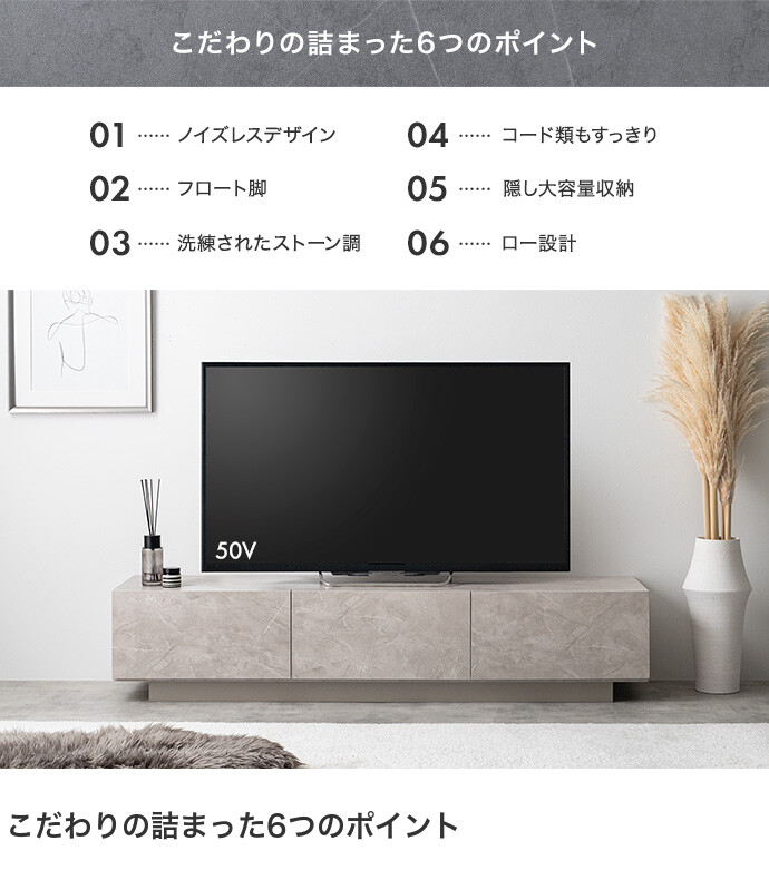 ストーン柄のニュアンスが上質な空間を作る引き出し付きテレビ台。無駄を省いたノイズレスなフォルムと、ストーン柄の組み合わせが美しいデザイン。お部屋に置くだけでアクセントとなり、洗練された空間へと導きます。また3種類の収納スペースにより、デジタル機器や小物を収納可能。視線の集まるテレビ周りをすっきり整えられるテレビ台です。