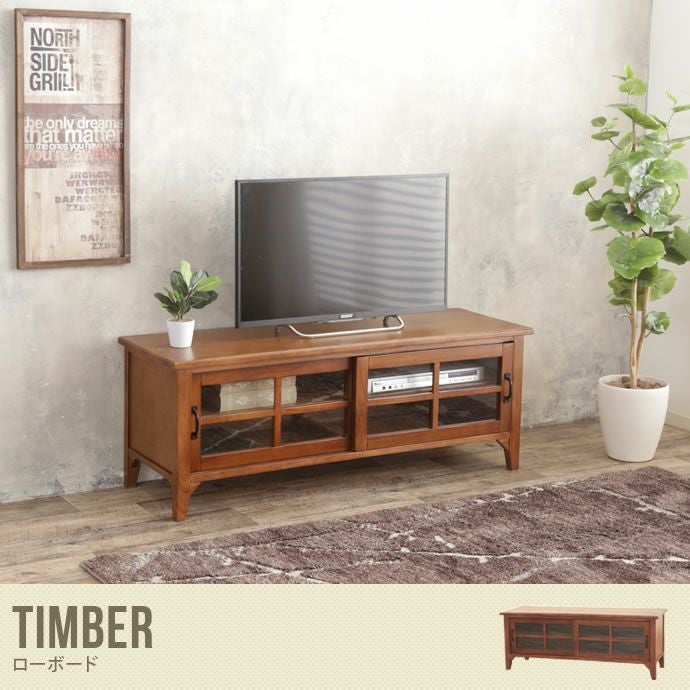 木目が美しい天然木を贅沢に使用した『Timber』シリーズからローボードが登場しました。細部まで洗練されたデザインで高級感があり、お部屋の雰囲気をぐっと引き締めてくれる人気シリーズです。素材は高級素材のミンディという天然木を使用しており、味わいのあるアンティーク調の木目がガラス製の引き戸と相性抜群でとってもオシャレに仕上がっています。幅120cmの絶妙なサイズ感で扱いやすく、完成品でのお届けなので工場でしっかり組立てられており、届いてからすぐにご利用頂けます。