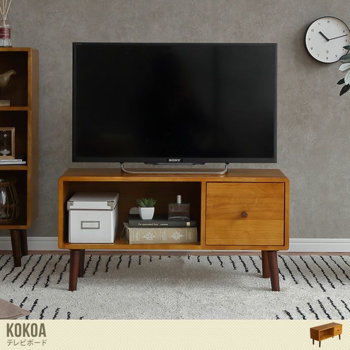 幅80cmのシンプルでコンパクトなデザインのテレビボード“KOKOA(ココア)”。コンパクトながら使い勝手バツグンです!オープン棚収納と引き出し収納があり、オープン棚収納には背板に配線穴があるのでAV機器類の設置に便利。DVD類は引き出しに収納できます。並べて収納できるので、タイトルが見やすいです。また、こちらの商品は脚部を取り付けていただくだけの簡単組立なので、女性でも安心してお使いいただけます。