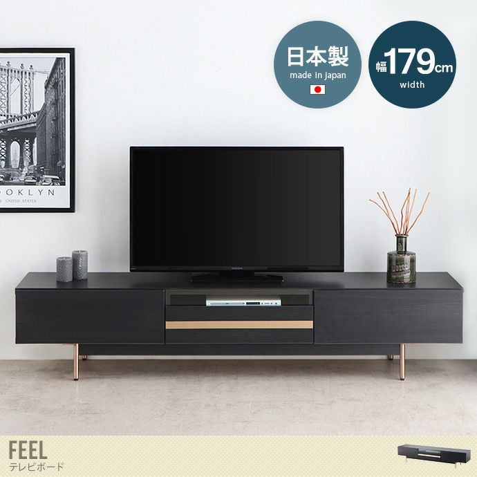 リアルな木目が美しい『FEEL(フィール)』シリーズのテレビボード。ブラックの木目×スチール脚の上品な組み合わせが、落ち着きのあるシックな空間を演出します。また、開閉がしやすいフルスライドレール付きの引き出しを3杯備えているので、AV機器やDVD、小物類などをたっぷり収納することが可能。リビングの小物をまとめて収納できるので、すっきりとしたお部屋を実現できます。