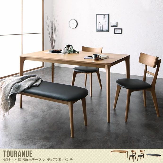 天然木(オーク)を使ったおしゃれなダイニング4点セット。落ち着きのある色合いで食卓を魅力的に彩ります!幅150cmのテーブルはスッキリフォルムで様々なインテリアとも相性バツグン!!足元ゆったりで立ち座りにも便利。チェアとベンチはどこから見ても美しいシルエットに♪長時間座っていても疲れにくい仕様となっているのでおウチでのリラックスタイムにオススメ。直線と曲線をうまく使い分けたデザインは上品さがありながらもお部屋全体の雰囲気を優しく演出します。毎日の暮らしを楽しくするインテリアアイテムです。