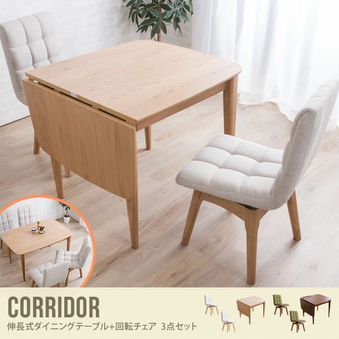 天板を伸ばせるテーブルと2脚の回転チェアがセットになったダイニングセットです。お客様が来た時には天板を80cm幅から120cm幅に伸ばすことができます。回転チェアは振り向きや立ち座りがラクラク!