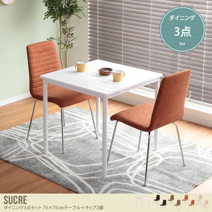 天板サイズ75cm×75cmとコンパクトサイズのテーブルと、ファブリック仕立てのチェア2脚がセットになったお得なダイニングセットです。無駄のないシンプルなデザインで、ダイニングスペースをモダンなイメージに演出してくれます。チェアの張地は落ち着きのあるカラー展開で、どのお色もお部屋に馴染みやすい色調。コットン70%、ポリエステル30%の生地を使用しており、蒸れにくく1年中気持ち良くご使用いただけます。