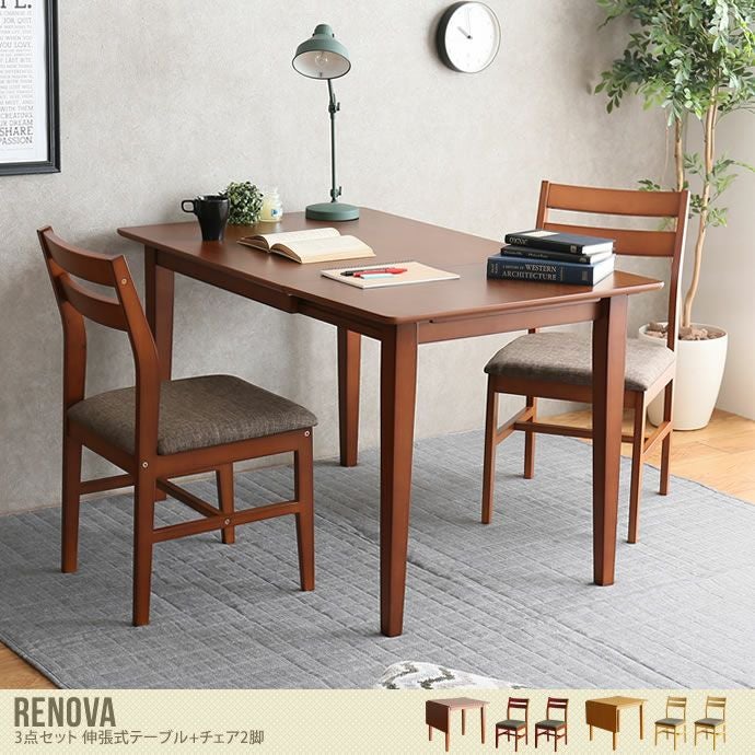 天板を広げて使えるテーブルと、チェア2脚がセットになった『Renova(レノバ)』ダイニングセットです。お部屋をスッキリ使いたいときはコンパクトサイズで使うことができ、料理をたくさん並べたい時は天板を広げることができます。チェアは、程よいクッション性のある座面で長時間座っていても疲れにくくなっています。シンプルダイニングセットで、お部屋で過ごす時間がより楽しくなります!