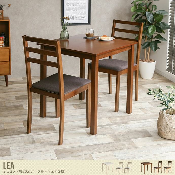 一人暮らしを始める方や新婚さんにおススメ!シンプルなデザインで、どんなインテリアにも合う『Lea(レア)』ダイニング3点セットです。幅70cm、正方形タイプの嬉しいコンパクトサイズで置き場所に困りません。テーブルは、手ざわりが滑らかな自然の素材を使用し温かみが感じられる仕上がりで、チェアは、シンプルな構造でありながら耐荷重約100kgと丈夫。座面はファブリック仕様なので、1年中気持ち良くご使用いただけます。