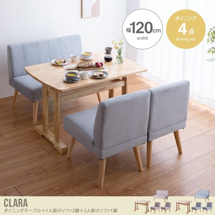 天然木の上質感とあたたかみ溢れる『Clara(クララ)』シリーズの、ダイニング4点セット。生活感を隠す棚を備えたダイニングテーブルは、繊細な木目が美しい天然木を使用し、いつもの食卓を上品に演出します。また、コンパクトながらもきちんと座れる機能性抜群の1人掛けダイニングソファが2脚、2人掛けダイニングソファが1脚つき。ご家族やご友人を招いて食卓を囲むシーンでも大活躍します。ソファは撥水加工が施されており、水に濡れてしまってもお手入れが簡単にできます。