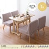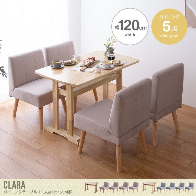 天然木の上質感とあたたかみ溢れる『Clara(クララ)』シリーズの、ダイニング5点セット。生活感を隠す棚を備えたダイニングテーブルは、繊細な木目が美しい天然木を使用し、いつもの食卓を上品に演出します。また、コンパクトながらもきちんと座れる機能性抜群の1人掛けダイニングソファが4脚つき、ご家族やご友人を招いて食卓を囲むシーンでも大活躍します。ソファは撥水加工が施されており、水に濡れてしまってもお手入れが簡単にできます。
