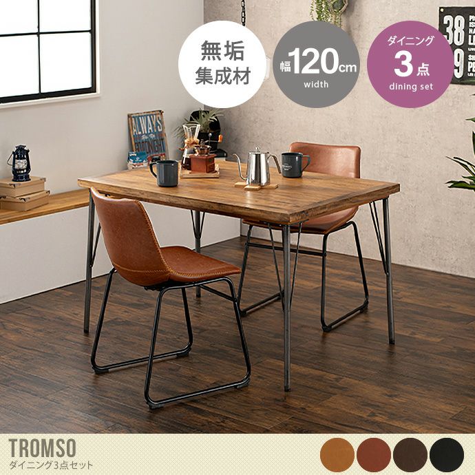 天然木のマンゴーウッドとアイアン脚を合わせたクールなテーブルと本革を再現したおしゃれなチェアを合わせたダイニングセット『Tromso(トロムソ)』。3タイプ4カラーから選べるダイニングセットで、マンゴーウッドの滑らかな手触りと木目の深みが、使い込まれたようなヴィンテージ感をお部屋に運んでくれます。