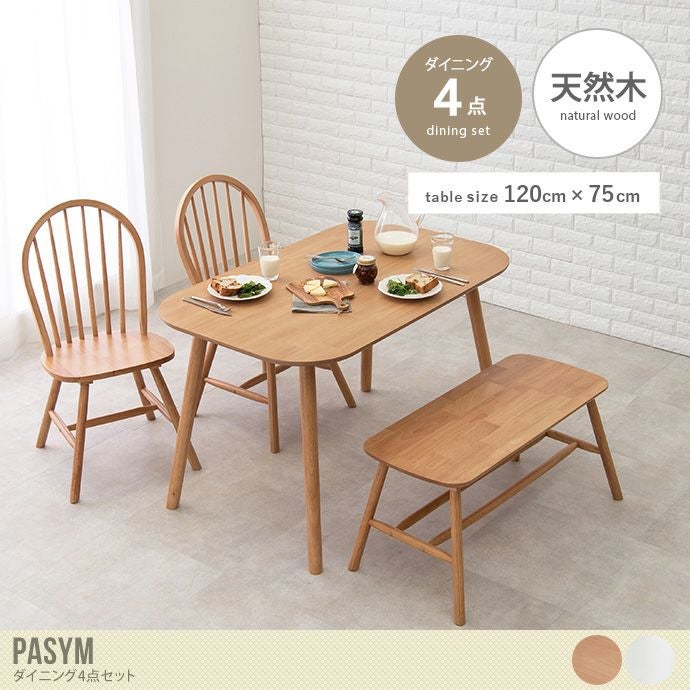 天然木を使用した『Pasym(パシム)』シリーズからダイニング4点セットが登場。収納付きのベンチとイギリスで古くから愛されるウィンザーチェア、さらに暮らしを彩るカフェ風のダイニングテーブルがセットになりました。ナチュラルでシンプルなデザインがお部屋に馴染みやすく、日常の様々なシーンに溶け込んでくれます。また、セット商品でも難しい組立はないので簡単に組み立てることができます。