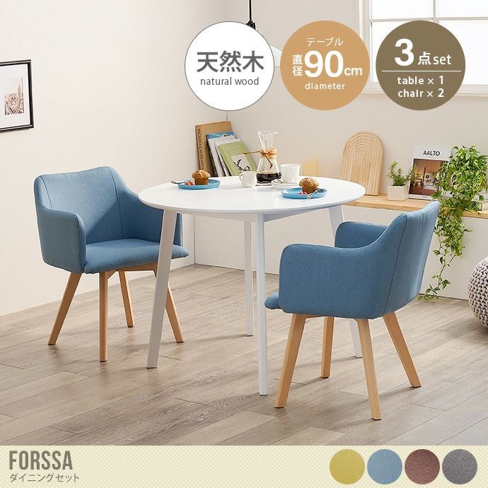 ファブリック×天然木の温かみのある風合いで、北欧を連想させるシンプルなデザインのダイニング3点セット『Forssa(フォルッサ)』。チェアの背もたれは高さを低めに設定している為、お部屋の圧迫感を軽減してくれます。さらに天板は、直径90cmと広々としたスペース。食事や休息時など、シーンを問わずに使いやすい設計です。カラーはバリエーションが豊富なのでお部屋にあったお好きなカラーを選んでいただけます。