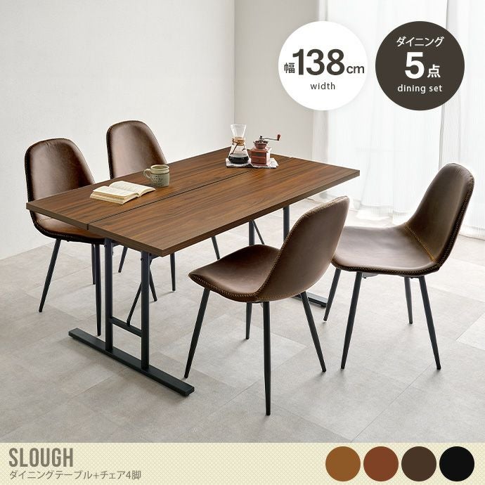 重厚感がありつつスタイリッシュなデザインの『Slough(スラウ)』シリーズのダイニングセット。重厚感あるテーブルに、ヴィンテージ調の合成皮革を使用したレザーチェアを組み合わせました。テーブルの脚はT字型になっており、足元にスペースがあるため立ち座りの動作を快適に。また広い天板はお手入れもしやすく、長く快適にお使いいただけます。お部屋に置くだけで、まるでカフェにいるような落ち着いた空間を演出します。