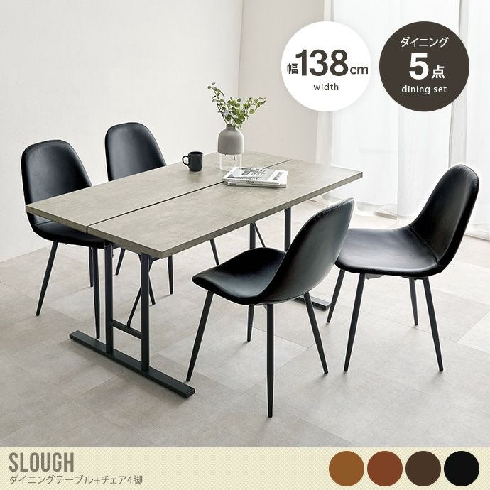 重厚感がありつつスタイリッシュなデザインの『Slough(スラウ)』シリーズのダイニングセット。重厚感あるテーブルに、ヴィンテージ調の合成皮革を使用したレザーチェアを組み合わせました。テーブルの脚はT字型になっており、足元にスペースがあるため立ち座りの動作を快適に。また広い天板はお手入れもしやすく、長く快適にお使いいただけます。お部屋に置くだけで、まるでカフェにいるような落ち着いた空間を演出します。