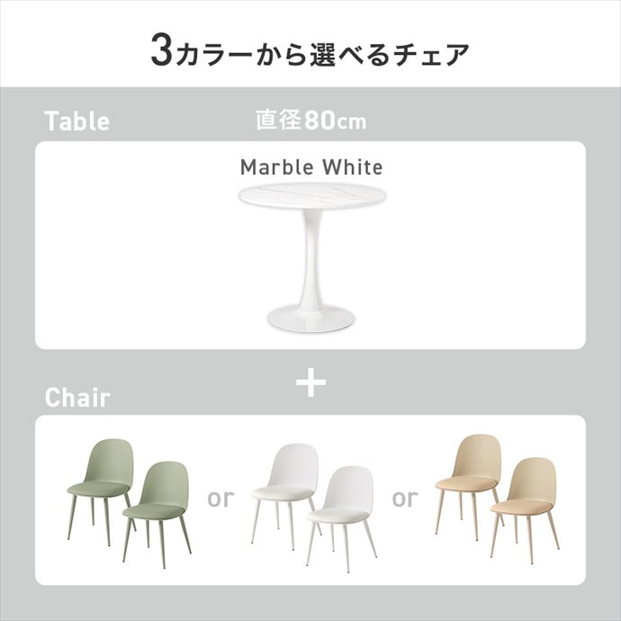 丸いフォルムが空間をやさしく見せるカフェテーブルと、くすみカラーがかわいいチェアを組み合わせたダイニングセット。角のない丸テーブルは視覚的な圧迫感が少なく、限られたスペースにもすっきりと置いていただけます。また座る位置を選ばないため、自由な距離感で心地よい会話が楽しめるのも魅力です。毎日の食卓がリラックスしたコミュニケーションの場となり、暮らしを上質に彩ります。