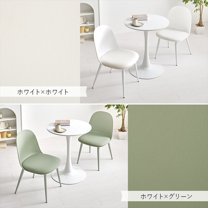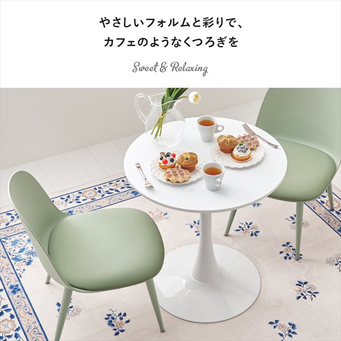 丸いフォルムが空間をやさしく見せるカフェテーブルと、くすみカラーがかわいいチェアを組み合わせたダイニングセット。角のない丸テーブルは視覚的な圧迫感が少なく、限られたスペースにもすっきりと置いていただけます。また座る位置を選ばないため、自由な距離感で心地よい会話が楽しめるのも魅力です。毎日の食卓がリラックスしたコミュニケーションの場となり、暮らしを上質に彩ります。