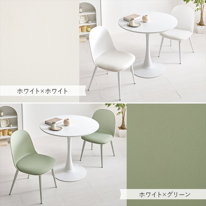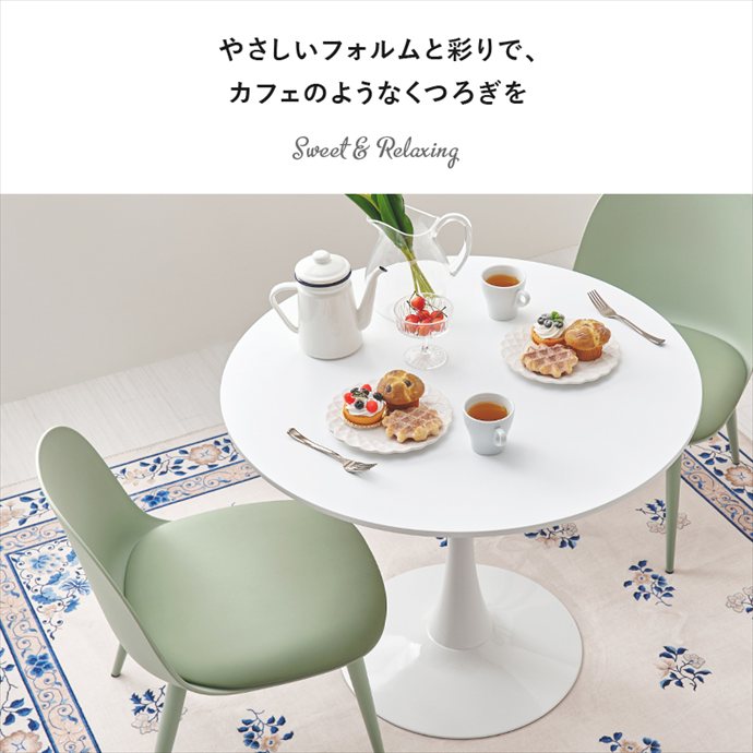 丸いフォルムが空間をやさしく見せるカフェテーブルと、くすみカラーがかわいいチェアを組み合わせたダイニングセット。角のない丸テーブルは視覚的な圧迫感が少なく、限られたスペースにもすっきりと置いていただけます。また座る位置を選ばないため、自由な距離感で心地よい会話が楽しめるのも魅力です。毎日の食卓がリラックスしたコミュニケーションの場となり、暮らしを上質に彩ります。