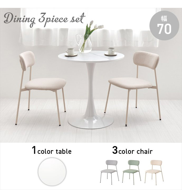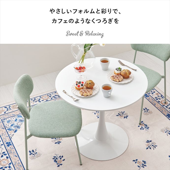 丸いフォルムが空間をやさしく見せるカフェテーブルと、くすみカラーがかわいいチェアを組み合わせたダイニングセット。角のない丸テーブルは視覚的な圧迫感が少なく、限られたスペースにもすっきりと置いていただけます。また座る位置を選ばないため、自由な距離感で心地よい会話が楽しめるのも魅力です。毎日の食卓がリラックスしたコミュニケーションの場となり、暮らしを上質に彩ります。