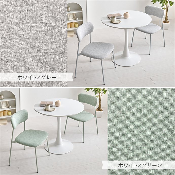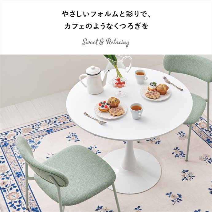 丸いフォルムが空間をやさしく見せるカフェテーブルと、くすみカラーがかわいいチェアを組み合わせたダイニングセット。角のない丸テーブルは視覚的な圧迫感が少なく、限られたスペースにもすっきりと置いていただけます。また座る位置を選ばないため、自由な距離感で心地よい会話が楽しめるのも魅力です。毎日の食卓がリラックスしたコミュニケーションの場となり、暮らしを上質に彩ります。
