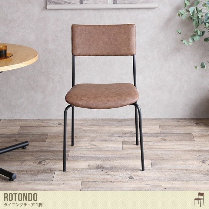 ヴィンテージテイストの『Rotondo』ダイニングチェア。スチール×レザーの組み合わせがちょっぴりスタイリッシュな空間を演出♪ お家の一角がおしゃれカフェのような佇まいに大変身! 座り心地にもこだわり、腰から背中にかけての緩やかなカーブが座った時に背中をしっかりと支えてくれますよ。完成品でお届けしますので、届いたその日からお使いいただけます。