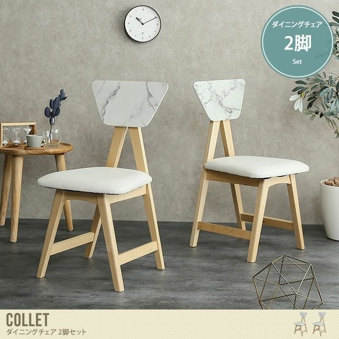 デザインへのこだわりが詰まった『Collet(コレット)』シリーズのダイニングチェア2脚セットです。大理石柄と天然木バーチ材というこれまでになかった異素材の組み合わせ、背もたれのカットデザイン、下に向かって広がるAラインの脚部など、細部にまでこだわったデザインです。まるでデザイナーズチェアのような佇まいで、ダイニングチェアとして使うだけでなく単品で置いても絵になる美しさ。インテリアのアクセントになるチェアです。