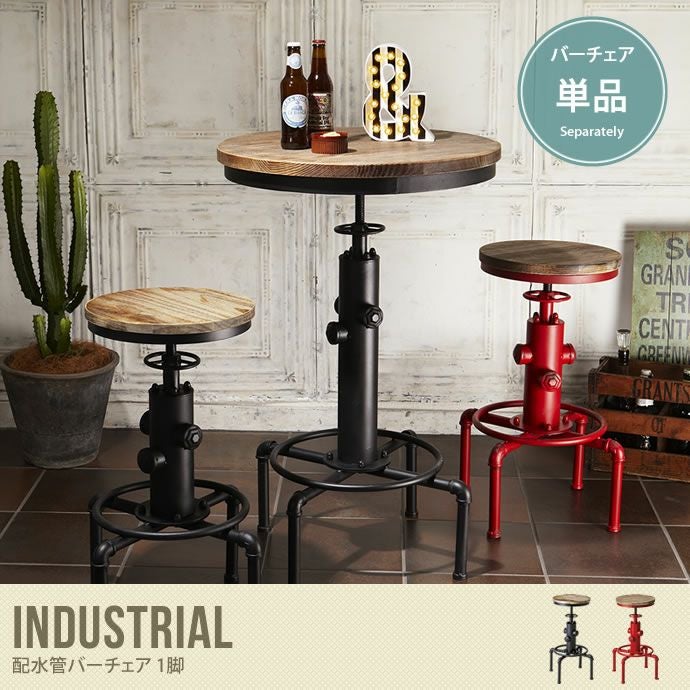 モチーフとしてパイプや配管を使った無骨で男前なデザインです。『Industrial』シリーズのバーチェアが登場しましたよ!!インパクトある見た目・絶妙なデザインバランスはお部屋に配置するだけで存在感バツグン!!素材にはパイン材を使い、はっきりとした木目が印象的です。使い込むほどによく馴染み、経年変化を楽しみながらお使いできるのもキーポイント。脚部部分はネジやパイプをあしらい、がっしり太めのフレームで座る人をしっかりと支えます。カラーはブラックとレッドの2色からお選び頂けます。