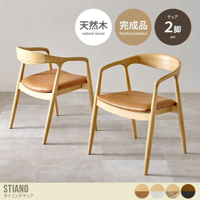 天然木の風合いが美しい『Stiano(スティアノ)』ダイニングチェア2脚セット。背もたれと肘掛けが一体化したデザインが、お部屋を洗練された上質な空間に。腕を休められるアームレストと、背中をしっかり支える背もたれが毎日の食事時間を心地よくサポートします。張地は4タイプから選べるため、お部屋に合ったお好みのデザインをお選びください。