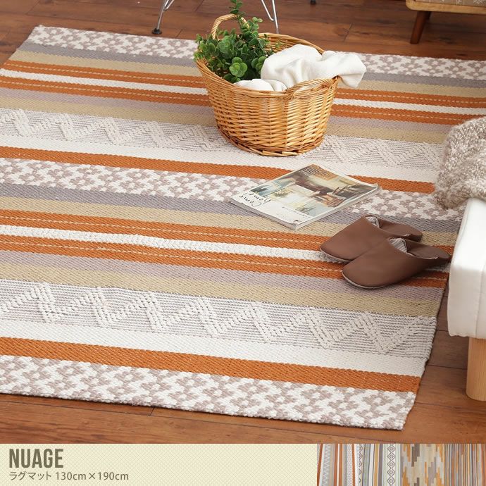 職人がひとつひとつ織り上げたインド製ハンドメイドラグです。オレンジを基調とした全体的にカラフルな色使いですのでお部屋を明るい印象に変えてくれます。北欧系やアジアン系のスタイルにハマり、ワントーンコーディネートにも◎ 他にあまりない独特のデザインとカラーリングがインテリアのポイントとなり、お部屋につい友人を招きたくなるような空間に♪ お部屋のテイストに合わせてお好きなデザインをお選びください。こちらでは【130cm×190cm】のラグを販売しています。