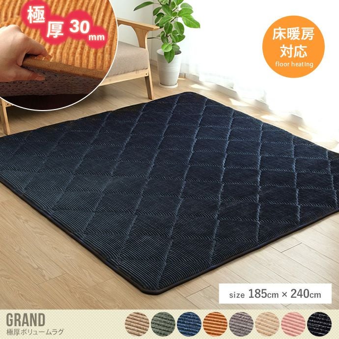表地にコーデュロイ調のキルティングを施した極厚ボリュームラグ『Grand(グランド)』。弾力と柔軟性に優れたフランネルでできている為、手触りがとてもやわらかく気持ちいいです。中材には30mmのウレタンフォームを使用。へたりにくく、ボリューム感がある為フローリングでくつろぎたい方におすすめです。また防音効果もあるので下の階に音が響きにくく、安心して使っていただけます。