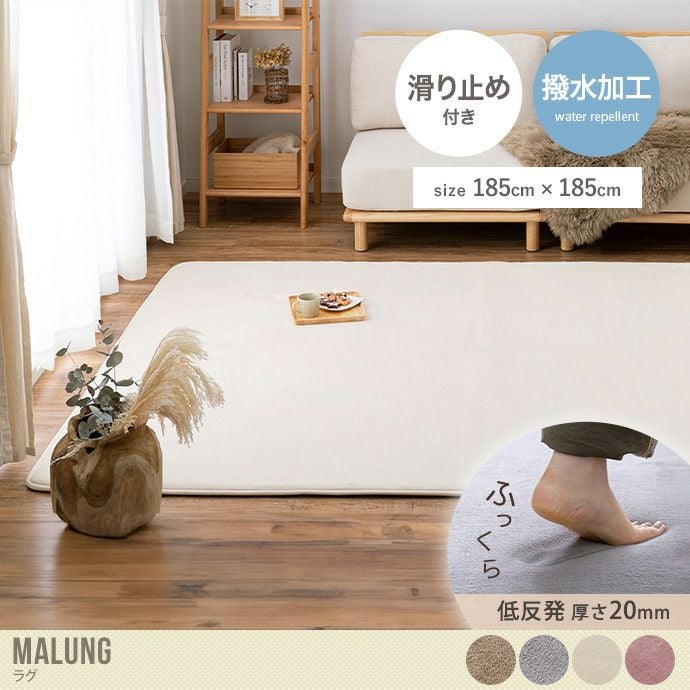 まるで泡立てたメレンゲのような肌ざわりの『Malung(マールング)』シリーズの低反発ラグ。こちらは185cm×185cmの正方形タイプです。表面にはしっとりと柔らかいポリエステル100%フランネル生地を使用。また、厚みは20mmとふっくらした低反発ウレタンを中材に使用しているので、床の硬さを感じさせない心地よい弾力となっています。しっかりとした厚みとクッション性で足音など、階下への防音対策にもなる優れもの。撥水加工を施しているので、飲み物などをこぼしてしまってもサッと拭き取ることが可能です。汚れても手洗いができるので、安心してお使いいただけます。裏面には滑り止めが付いており、しっかり固定されて掃除機をかけてもズレにくくい仕様。ホットカーペットや床暖房にも対応しているので、寒い時期にも大活躍です。
