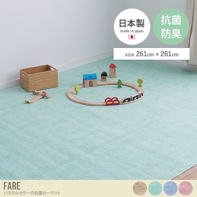 敷くだけでお部屋がぱっと明るくなるパステルカラーの『Fare(ファーレ)』日本製抗菌カーペット。肌ざわりの良いふわふわカーペットです。表面のパイルはカットされているので、ペットのいるご家庭でも爪が引っかからず安心してお使いいただけます。生地は、ポリエステルにアクリルを2%入れることで、まだらミックス感をだし汚れを目立ちにくくしました。大きさは、江戸間3帖から10帖までと幅広いサイズ展開なので部屋全体に敷き詰めたり、大きめのラグとしても使用可能です。
