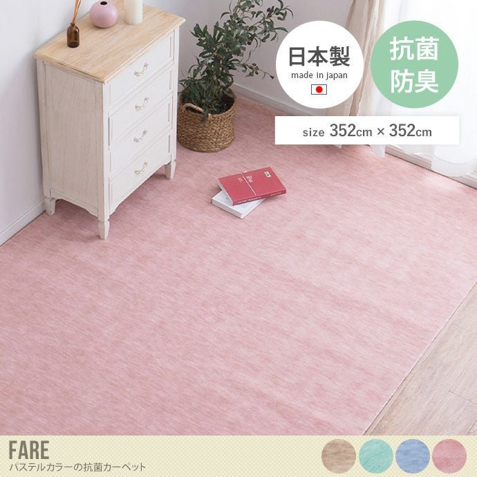 敷くだけでお部屋がぱっと明るくなるパステルカラーの『Fare(ファーレ)』日本製抗菌カーペット。肌ざわりの良いふわふわカーペットです。表面のパイルはカットされているので、ペットのいるご家庭でも爪が引っかからず安心してお使いいただけます。生地は、ポリエステルにアクリルを2%入れることで、まだらミックス感をだし汚れを目立ちにくくしました。大きさは、江戸間3帖から10帖までと幅広いサイズ展開なので部屋全体に敷き詰めたり、大きめのラグとしても使用可能です。