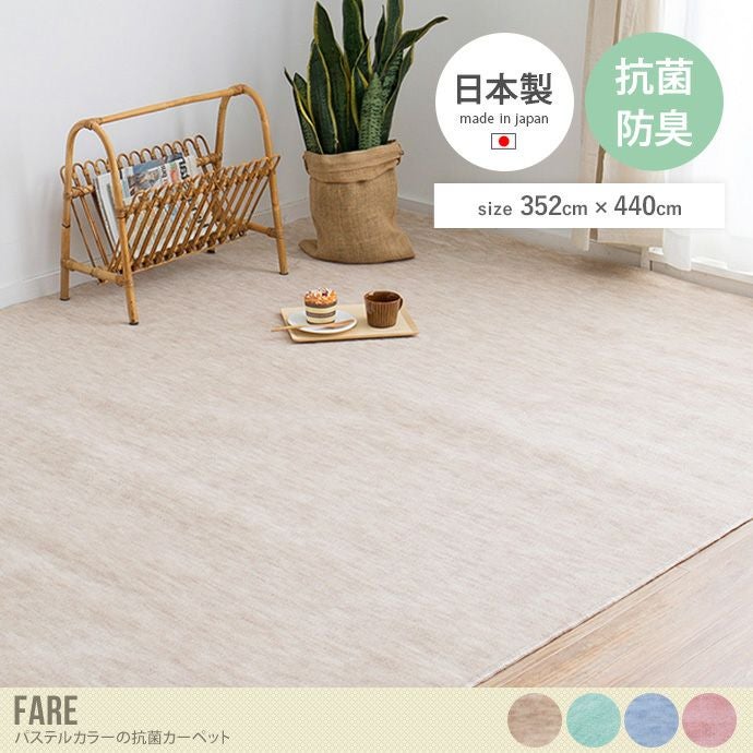 敷くだけでお部屋がぱっと明るくなるパステルカラーの『Fare(ファーレ)』日本製抗菌カーペット。肌ざわりの良いふわふわカーペットです。表面のパイルはカットされているので、ペットのいるご家庭でも爪が引っかからず安心してお使いいただけます。生地は、ポリエステルにアクリルを2%入れることで、まだらミックス感をだし汚れを目立ちにくくしました。大きさは、江戸間3帖から10帖までと幅広いサイズ展開なので部屋全体に敷き詰めたり、大きめのラグとしても使用可能です。