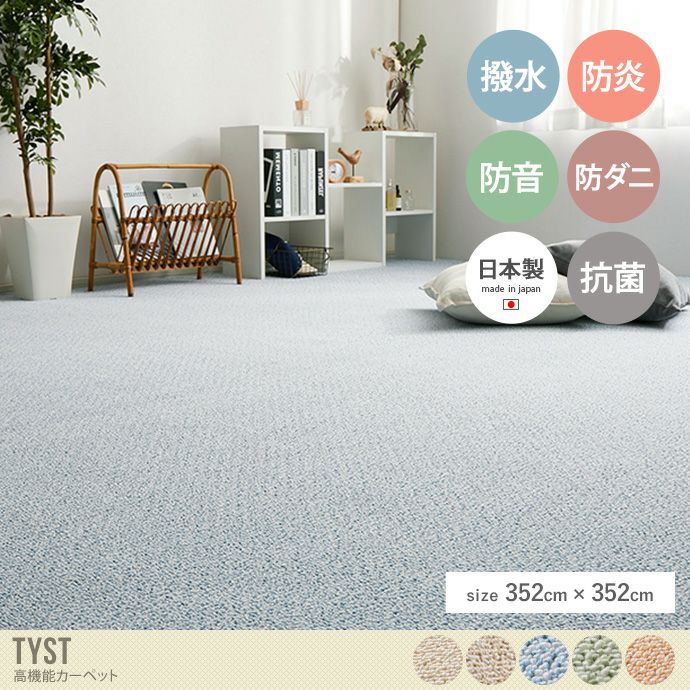 防ダニ・抗菌・防臭・撥水・防音と多機能な『Tyst(テュスト)』のカーペット。暮らしに嬉しい機能がたくさんついており、家族みんながいつでも快適に過ごせる空間を作ります。より合わせた糸と光沢のあるホワイト糸の交互織でしっかりとしたパイルを実現しました。また表面のパイルは、ループ仕様でへたりにくく、汚れも目立ちにくいので永く使っていただく事が可能です。