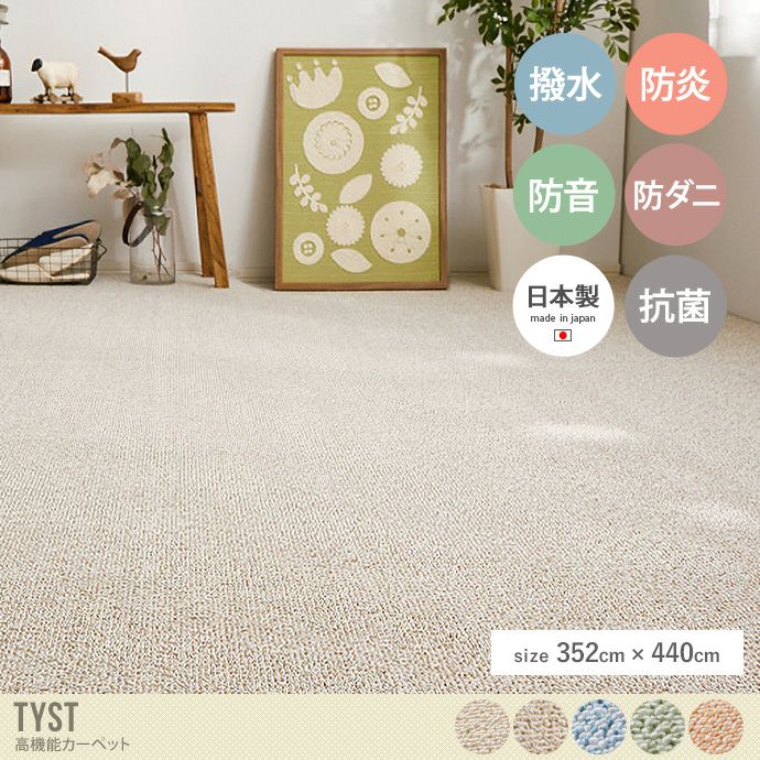 防ダニ・抗菌・防臭・撥水・防音と多機能な『Tyst(テュスト)』のカーペット。暮らしに嬉しい機能がたくさんついており、家族みんながいつでも快適に過ごせる空間を作ります。より合わせた糸と光沢のあるホワイト糸の交互織でしっかりとしたパイルを実現しました。また表面のパイルは、ループ仕様でへたりにくく、汚れも目立ちにくいので永く使っていただく事が可能です。