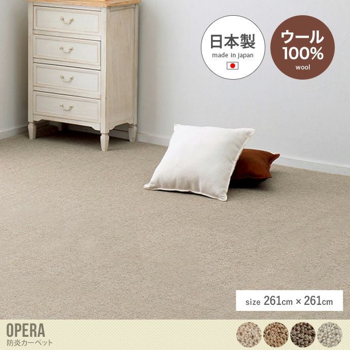 天然素材ウール100%の『Opera(オペラ)』防炎カーペット。通常のカーペットと比べ、密度少なめでふんわりとやさしいタッチを実現しました。ウールはホルムアルデヒドを吸着し、お部屋の空気をキレイに浄化してくれます。また、防ダニ・抗菌加工付きなのでいつでも清潔に使用可能。夏は涼しく、冬は暖かなウールカーペットで、オールシーズン快適に過ごしていただけます。