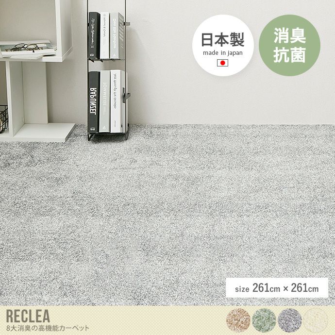 8大消臭機能付きの『Reclea(リクリア)』国産高機能カーペット。中材に消臭シートを入れることで、強力な消臭効果を実現しました。抗菌機能も優れているので、菌の繁殖を抑えていつでも清潔にお使いいただけるカーペットです。表面のパイルはカットされているので、ペットの爪が引っかからず、安心してお使いいただけます。