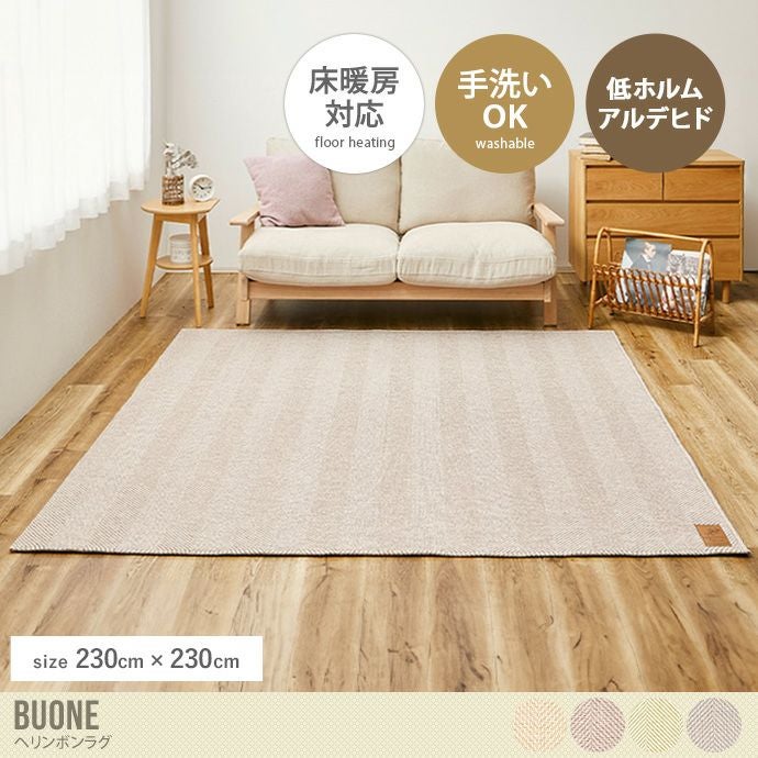 糸の組み合わせにこだわった『Buone(ボーナ)』ヘリンボンラグ。ざっくりとした織りで立体感のあるヘリンボン柄は遠目で見るとボーダー柄にも見え、見る角度で印象が変わる飽きのこないデザインになっています。また汚れても手洗いができるので、小さなお子様やペットがいるご家庭でも安心かつ清潔に使用が可能です。さらにホットカーペットや床暖と併用して使えるので、季節問わずオールシーズンお使いいただけます。