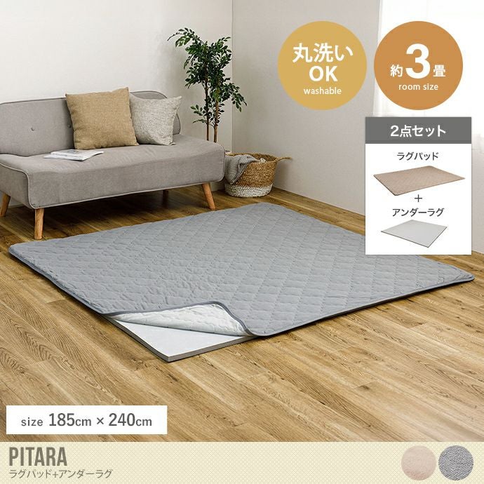 ピタッとズレずに密着してくれる『Pitara(ピターラ)』ラグパッド+アンダーラグ2点セット。吸いつくような密着感で、ラグのズレ問題もラクラク解決。折り返しても落ちにくく、掃除機掛けもスムーズにしていただけます。またラグは綿100%のさらっと優しい触り心地のパイル生地を使用。季節問わずオールシーズンお使いいただけます。さらにアンダーラグは高反発で寝転がっても床つき感なく、しっかりとしたウレタン仕様で防音対策にも最適。小さなお子様がいるご家庭でも安心してお使いいただけます。