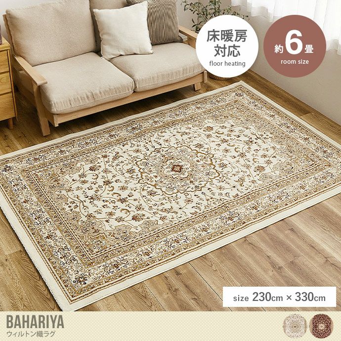 クラシック調の美しいデザインが、インテリアに華やかさを加える『Bahariya(バハレイヤ)』ウィルトン織ラグ。高密度に織り上げたパイルは耐久性があり、遊び毛も出にくいためお手入れも簡単。ヒートセット加工により、ゴミが入りにくく、長期間美しい状態を保てます。さらに床暖房やホットカーペットにも対応しており、オールシーズン快適に使用可能。シンプルな部屋にも上品なアクセントを加える一枚です。