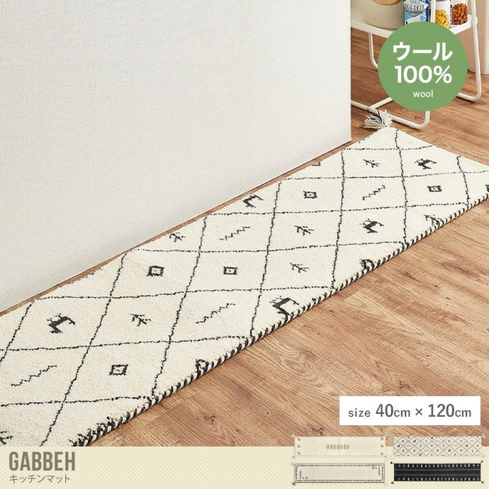 遊牧民の知恵から生まれた『Gabbeh(ギャッベ)』キッチンマット。インドの職人が一枚一枚丁寧に手作業で織り上げるため、同じ柄でも微妙に異なる表情を持ち、手織りならではの温かみと個性が引き立ちます。どこか素朴でありながらも存在感のあるデザインが、お部屋やキッチンのアクセントに。また素材にはウールを使用し、保温性だけでなく湿度調整機能にも優れているため、一年中快適にお使いいただけます。