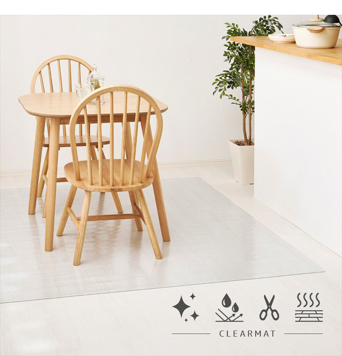 インテリアに溶け込むクリア素材のダイニングラグ。床面が透けて見えるため圧迫感がなく、お部屋の雰囲気を損なわずに床をしっかりと保護します。また抗菌・耐水性に優れたPVC素材を採用しており、お手入れ簡単。さらにハサミで簡単にカットできるため、必要に応じてサイズも調整可能です。約1.2mmの薄手設計で床暖房にも対応し、温もりを遮らず快適にお使いいただけます。