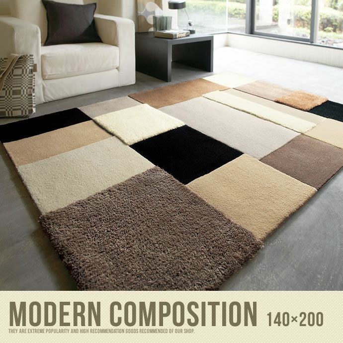 ブラウン系のアースカラーを使いながら、モダンでオシャレなデザインに仕上げました。アクセントにシャギーラグを用いた、素材感がユニークなカーペットです。