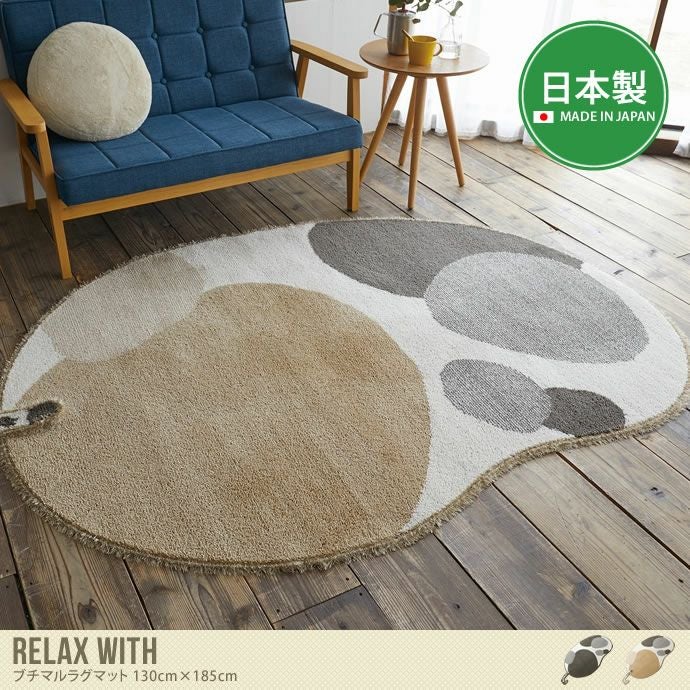 可愛いブチ模様を描いた“Relax with”ブチマルラグマット(130cm×185cm)。防ダニ加工と消臭加工を施しており、ペットを飼っているご家庭でも安心!耐熱加工を施しているので、床暖房やホットカーペットの上敷きとしてご使用いただけます。冬は暖かく、夏の暑い時期でもサラッとしているので、オールシーズンお使いいただけます。リビングや寝室などに敷いていただけるので、より一層快適な癒しのひと時を過ごすことができますよ。
