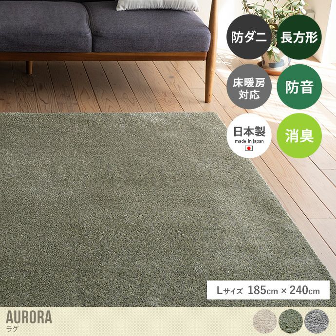 シンプルデザインでどんなお部屋にも合わせやすい『Aurora(オーロラ)』ラグ。環境に優しい消臭加工機能を施しており、光や電気を使わずに悪臭原因物質を安全な物質に分解します。生活臭を抑え、リビング空間を心地よく快適に過ごせる空間に。また厚手の不織布を使用した生地は防音性が高く、室内の衝撃音を和らげてくれるため防音対策にもぴったりです。床暖房にも対応しており、オールシーズンお使いいただけます。