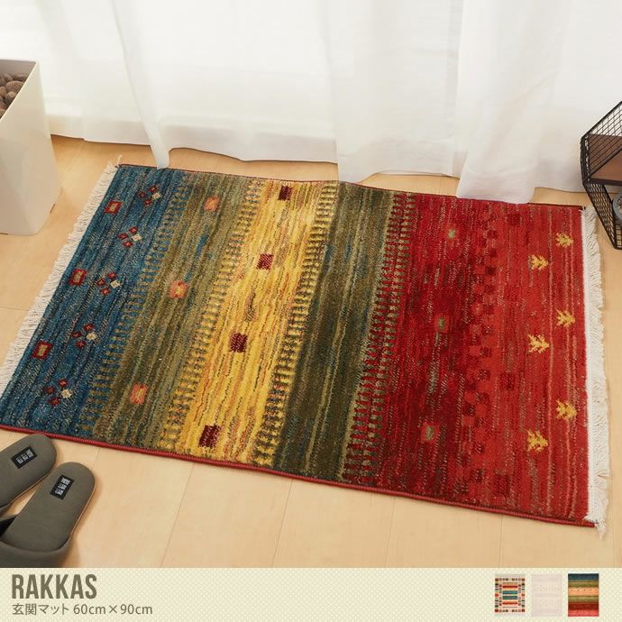 ラグの名産地トルコで織り上げられた『Rakkas(ラッカス)』玄関マット(60cm×90cm)。民族調の手織り絨毯の様なエスニックなデザインをウィルトン織機で織りあげました。縁のフリンジもポイント!毛足は1cm程ありますが、密度が高いので掃除機もかけやすいようデザインされています。また、しっかりとしたつくりでありながら、縦糸の特殊な加工により折りたたむことができる柔らかさです。丈夫で耐久性もあるので、長く使い続けたくなるアイテムです♪