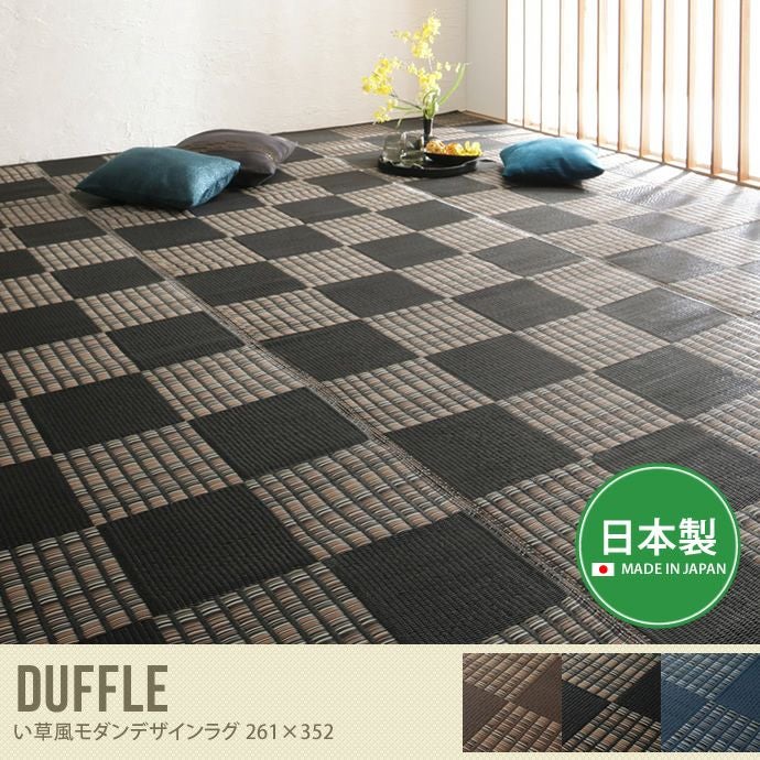 高級感のあるカラーリングで細部までこだわった市松模様がオシャレなラグマット「Duffle い草風モダンデザインラグ 261cm×352cm」。江戸間6畳分のサイズとなっています。落ち着いた和風のデザインとスタイリッシュでモダンなカラーリングでお部屋をぐっとオシャレにしてくれます。ポリプロピレン素材で吸水性がないため汚れたらシャワー等でダイレクトに洗えてお手入れも簡単、カビやダニの発生も防ぐのでいつまでも清潔にご利用頂けます。インテリアに合わせやすいブラウン、ブラック、ネイビーの3色展開でサイズ展開も豊富なのでお部屋に合わせてお選び頂けます。
