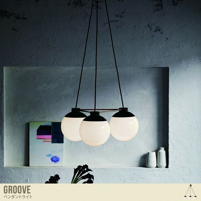 球状のガラスクローブが放つ光がお部屋を美しく照らし出します!”Groove・ペンダントライト”3つのガラスグローブが連なったペンダントランプは付属のホルダーバーを使って、トライアングル形とストレート形とフォルムチェンジができます。真鍮の金具とのコンビネーションは都会的な雰囲気でオシャレ度もUP!!ソケットカバーはマットなブラックで仕上げています。住宅をはじめホテルや店舗施設などにもオススメな照明器具。シックなシルエットは空間を上品に演出します。