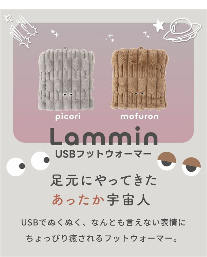 なんともいえない愛らしい表情に癒されるふわふわの『Lammin(ラミン)』電気フットウォーマー。USB発熱シート付きで、パソコンやモバイルバッテリーに接続するだけでじんわり暖かくなり、読書やデスクワーク、リラックスタイムも快適にお過ごしいただけます。また3段階の温度調節ができ、その日の気分や室温に合わせてちょうどいい暖かさに設定可能。肌ざわりは思わず触りたくなるふわふわ感で、フットウォーマーとしてはもちろん、丸めて手を入れればアームウォーマーとしても活躍します。