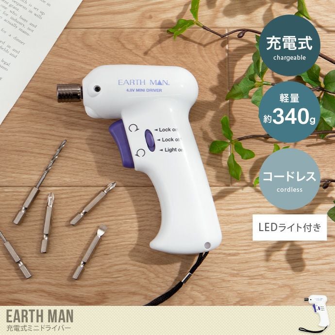 組み立てが楽しくなる『Earth man(アースマン)』充電式電動ドライバー。家具の組み立てや家電の電池の入れ替えなどをスムーズに、組み立て時間も大幅に短縮できます。軽量かつコンパクトなので持ちやすく、女性も使いやすい設計。またコードレスで小回りがきくので、高い場所での使用や、引き出しなどの狭い場所でも大活躍します。さらに手元をしっかりと照らしてくれるLEDライト付き。スイッチ一つでネジを締める・緩めるも選べる、使いやすさ抜群のドライバーです。