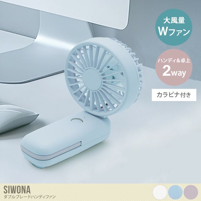 ダブルファンを搭載し、大風量を実現した『Siwona(シウォナ)』ダブルブレードハンディファン。異なる枚数とサイズの羽根を使用し、前後で回転方向を逆にすることで強力な風を生み出します。ハンディファンとしてだけでなく、卓上ファンとしても使用できる2WAY仕様で、角度は90度まで調整可能。カラビナが付いており、バッグに吊り下げることできるため、持ち運びにも便利です。カラビナはスライド式で本体に収納できるため、使わないときも邪魔にならずにしまっていただけます。
